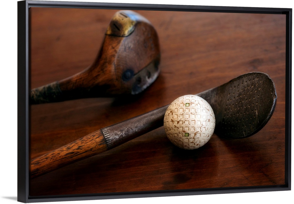 <p>Horizontal photograph on a large canvas of two antique golf clubs and a ball, lying on a wooden table.</p>