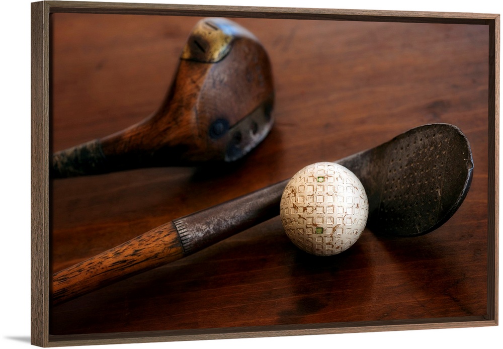 <p>Horizontal photograph on a large canvas of two antique golf clubs and a ball, lying on a wooden table.</p>
