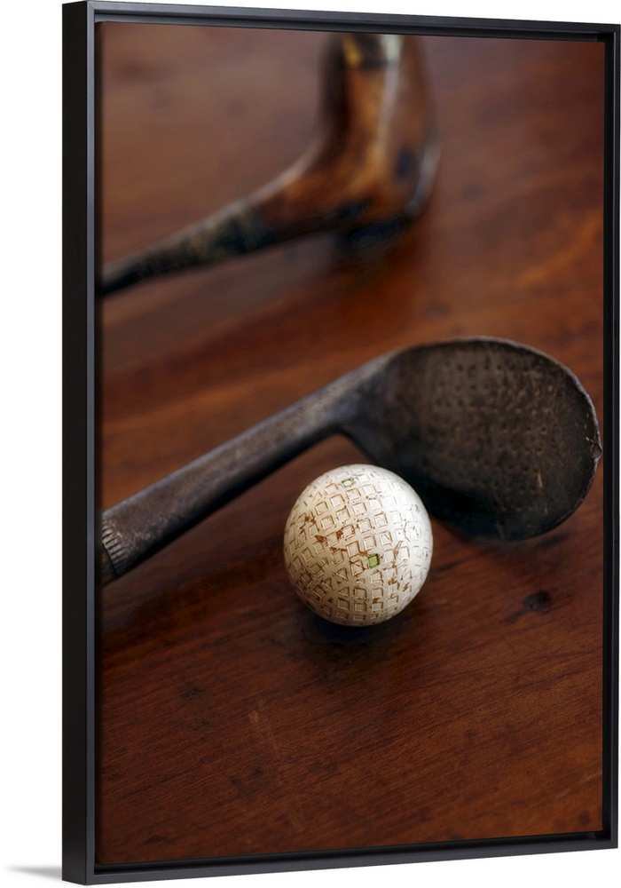 <p>Close up of antique golf clubs and golf ball</p>