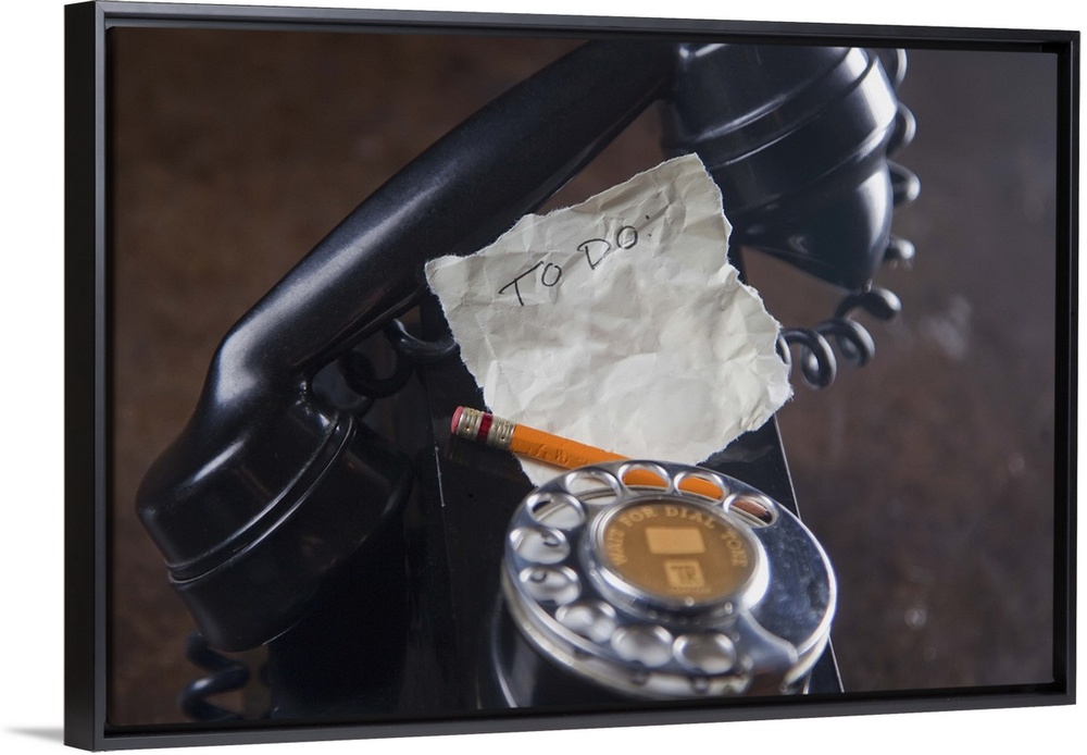 <p>close-up of antique telephone with pencil and 'to do' list</p>