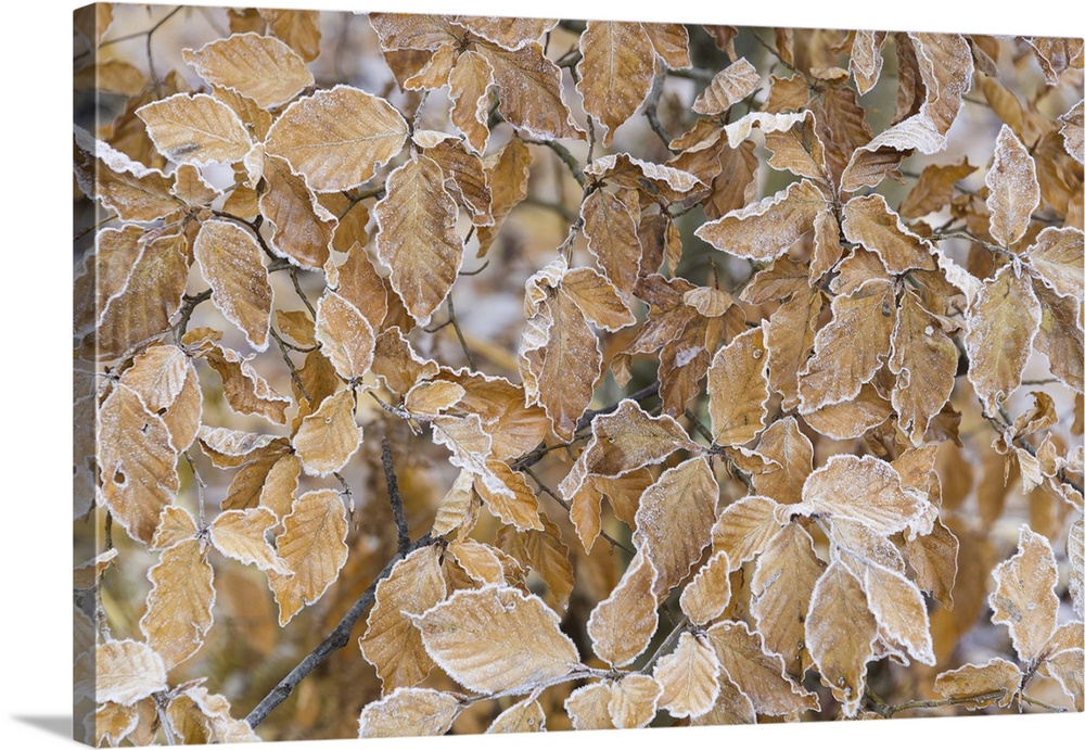 <p>Close-up of beech tree leaves in autumn covered with rime in the Odenwald hills in Bavaria, Germany</p>