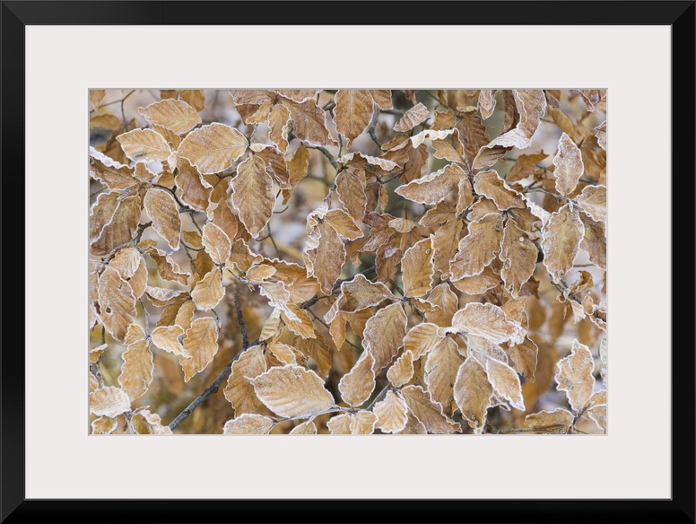 <p>Close-up of beech tree leaves in autumn covered with rime in the Odenwald hills in Bavaria, Germany</p>
