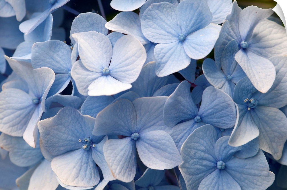 <p>Landscape, large, close up photograph from the National Geographic Collection of a large group of blue mophead hydrangea flowers (Hydrangea macrophylla).</p>