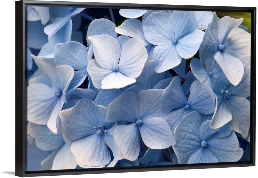 <p>Landscape, large, close up photograph from the National Geographic Collection of a large group of blue mophead hydrangea flowers (Hydrangea macrophylla).</p>