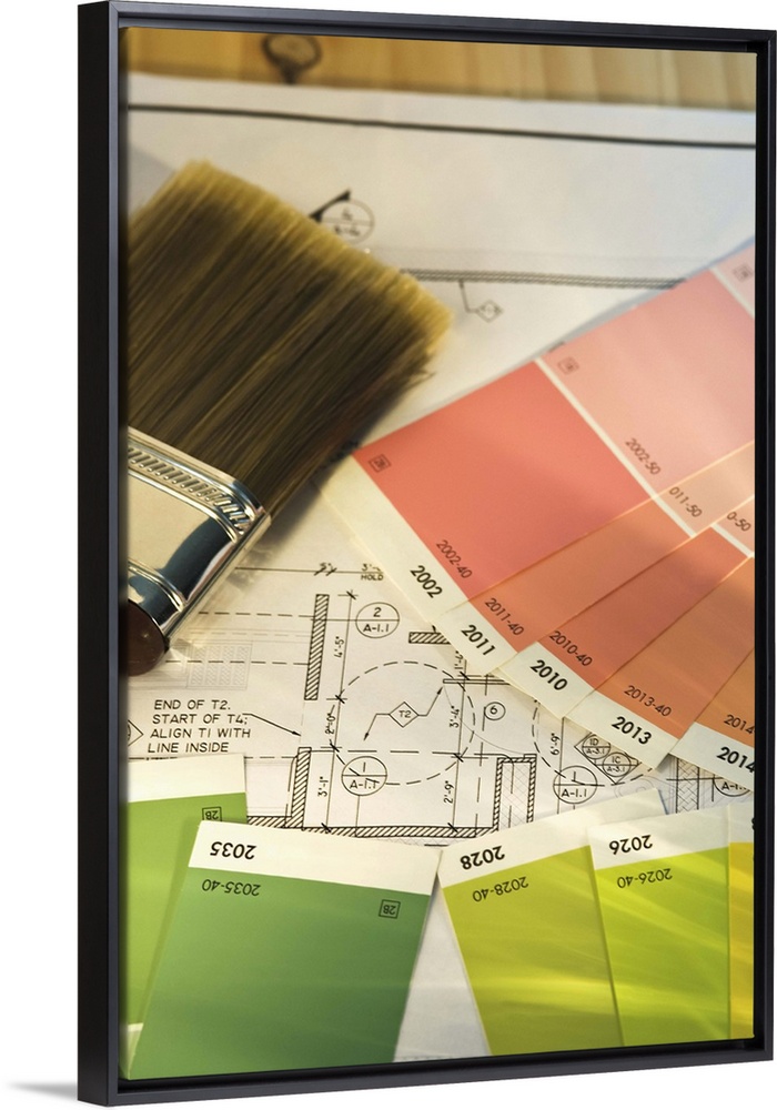 <p>Close up of blueprint and painting supplies</p>