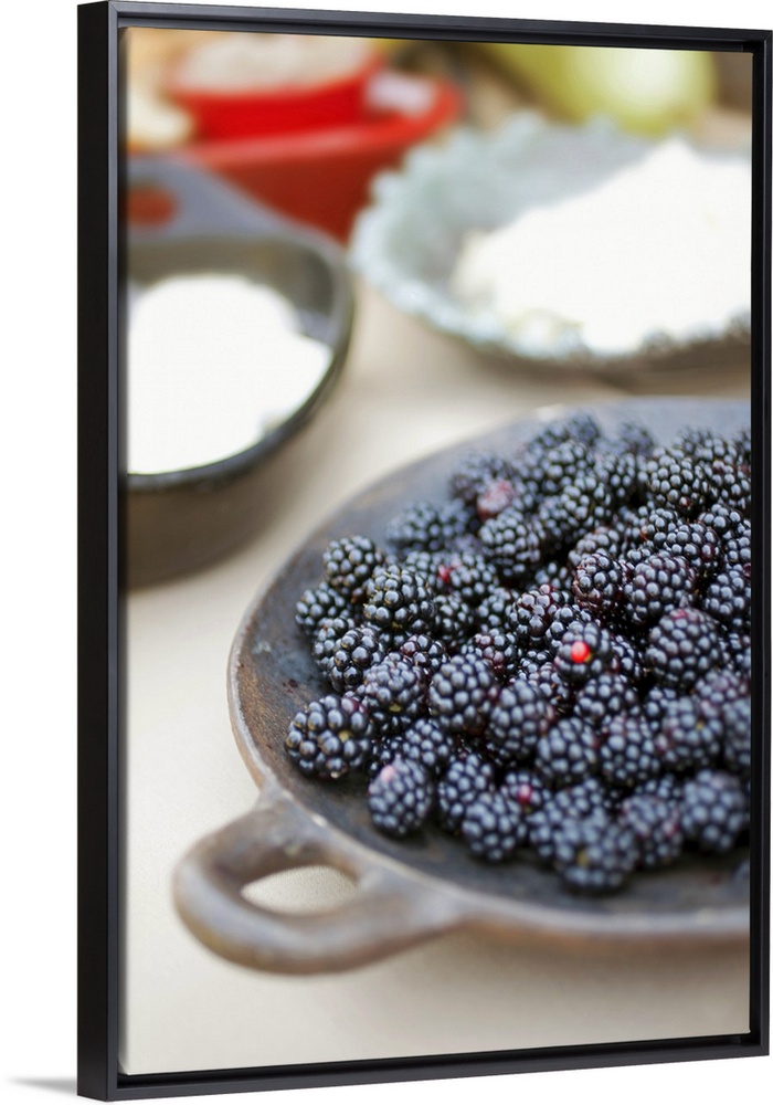 <p>Close up of bowl of blackberries on a table with bowls of cheese and breads in the background.</p>