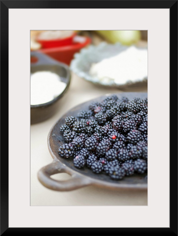 <p>Close up of bowl of blackberries on a table with bowls of cheese and breads in the background.</p>