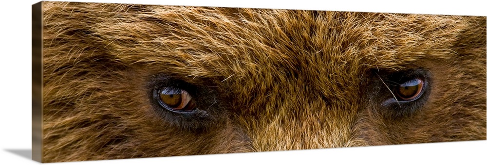 <p>A panoramic photograph taken very closely of just a brown bears eyes.</p>
