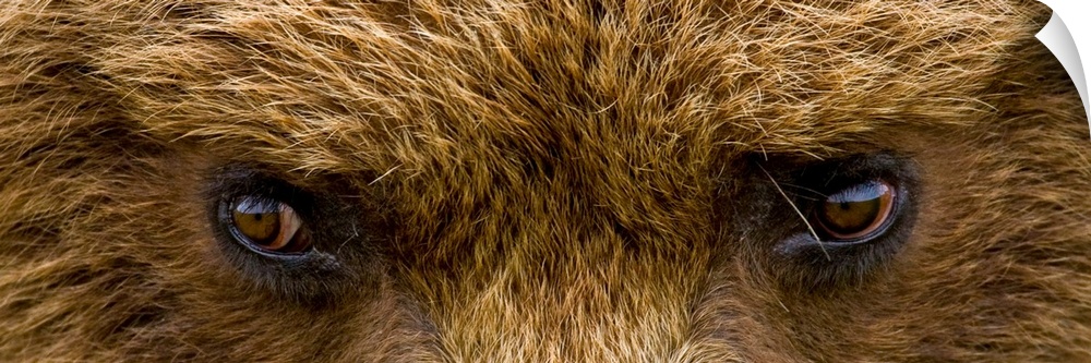 <p>A panoramic photograph taken very closely of just a brown bears eyes.</p>