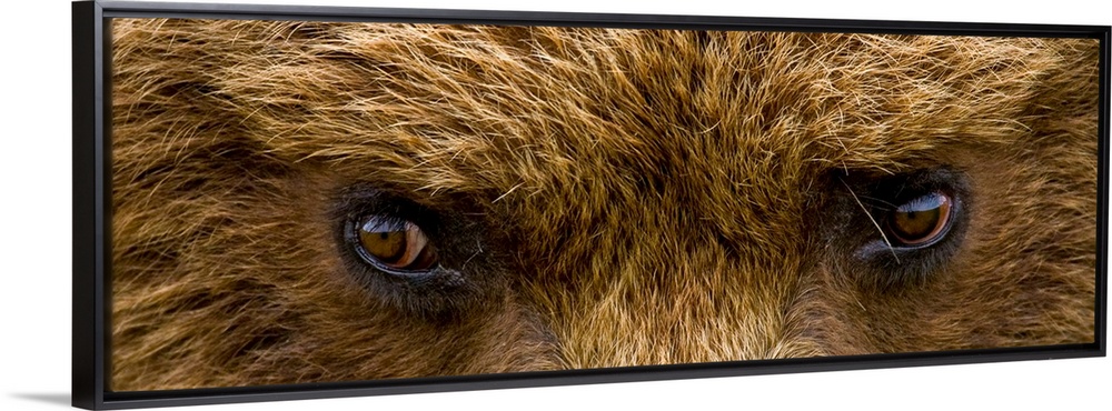 <p>A panoramic photograph taken very closely of just a brown bears eyes.</p>