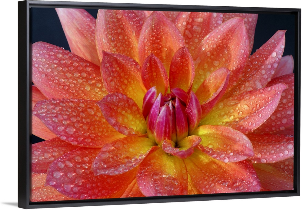 <p>Close up of center of orange dahlia, Dahlia 'Firepot', with water drops on petals, on a black background.</p>