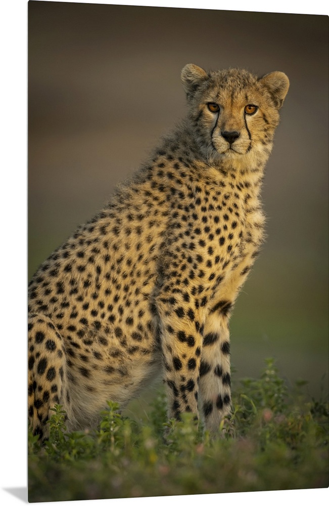 <p>Close-up of cheetah cub (acinonyx jubatus) sitting with catchlight, Serengeti national park, Tanzania.</p>