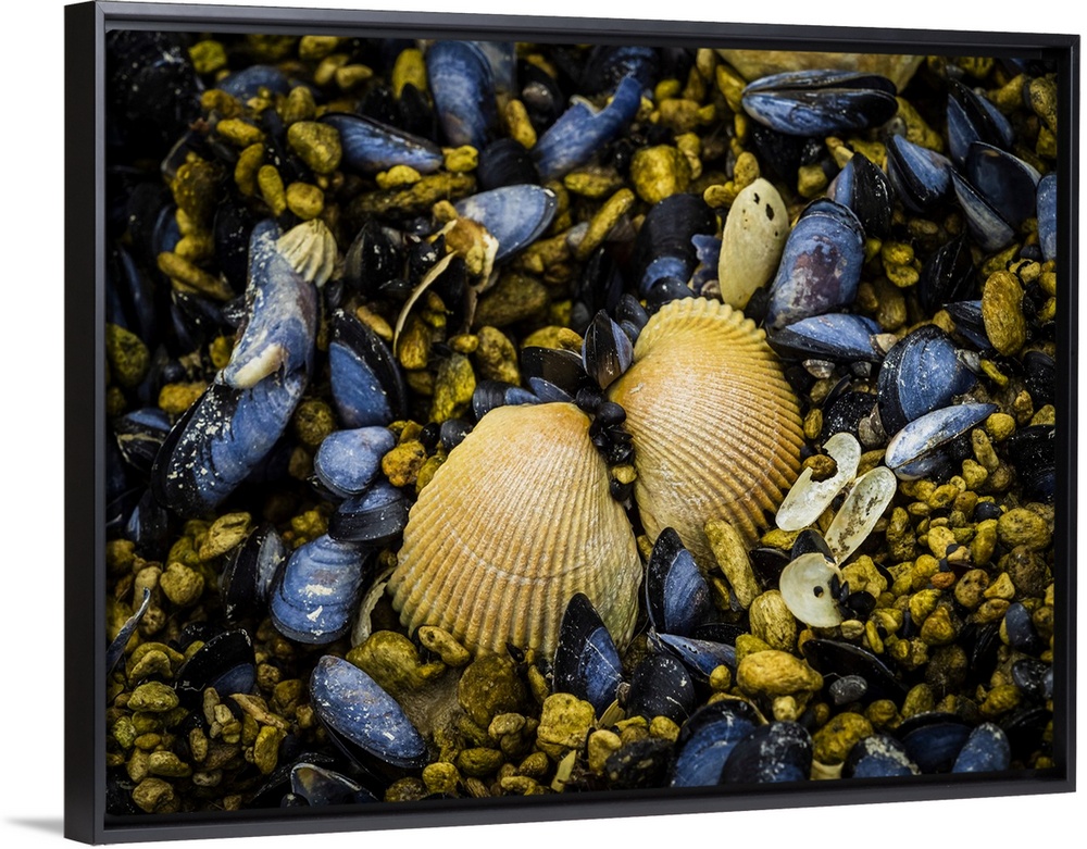 <p>Clam shell and blue mussels (Mytilus edulis) exposed at low tide in Geographic Harbor, Katmai National Park, Alaska</p>