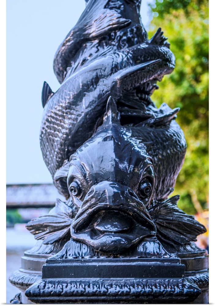 <p>Close Up of Dolphin lamp at River Thames in London, England. Despite being described as dolphin lamps, they appear to be sturgeon.</p>