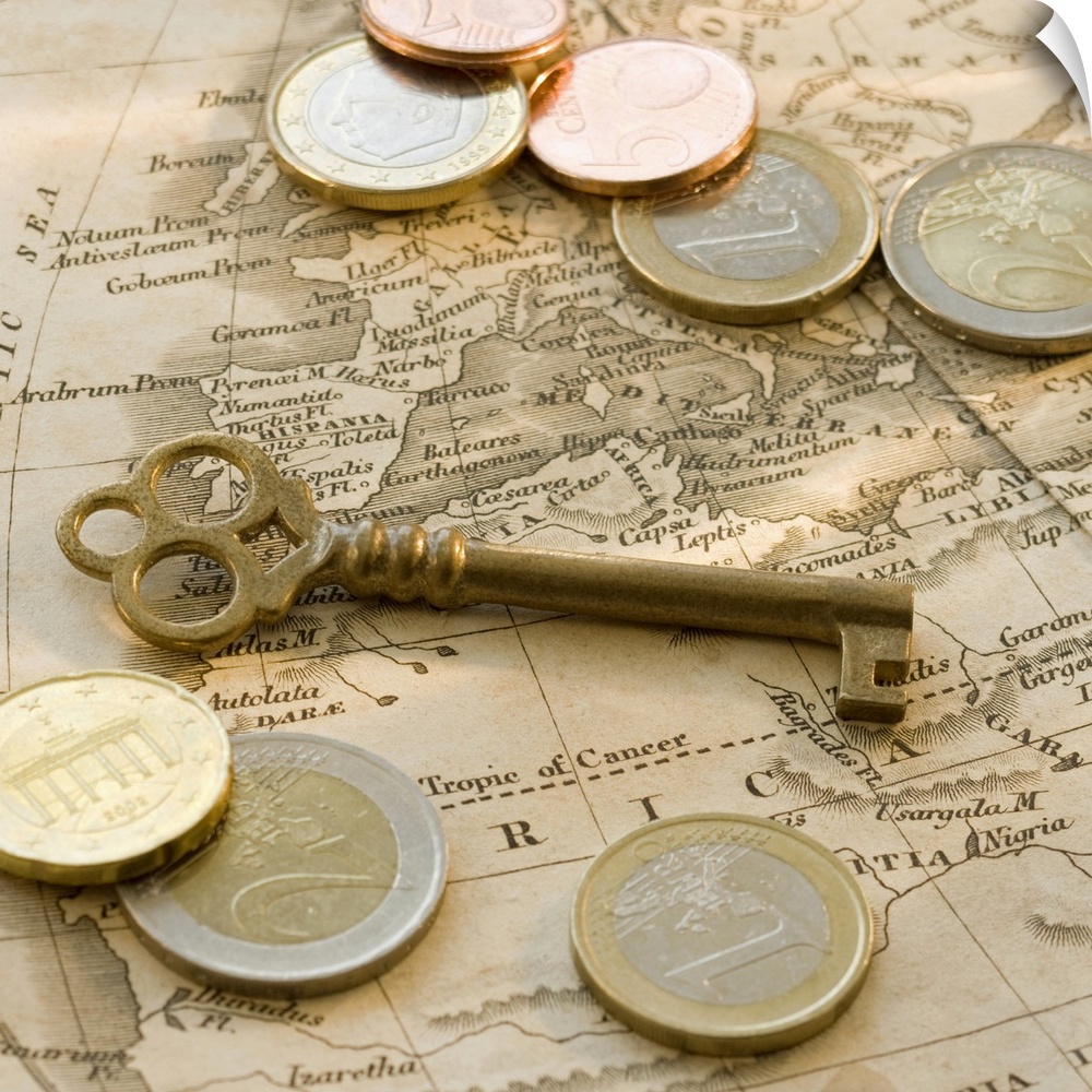 <p>Close up of euro coins, map and antique key</p>