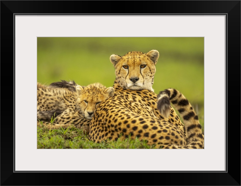 <p>Close-up of female Cheetah cubs (Acinonyx jubatus) lying together in Maasai Mara National Reserve; Narok, Masai Mara, Kenya.</p>