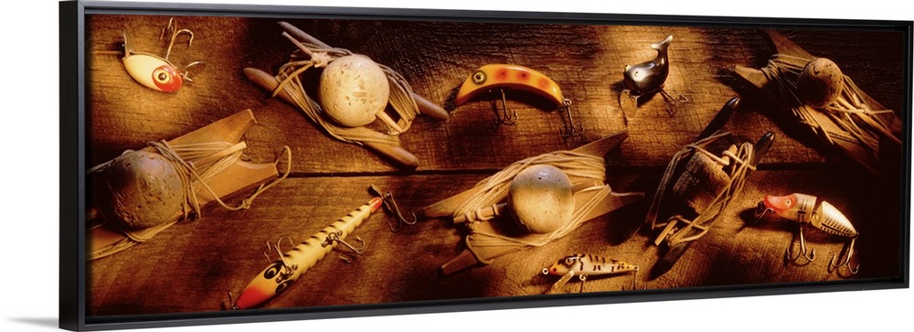 <p>Oversized, horizontal photograph of numerous types of fishing lures displayed on a rough, wooden surface.</p>