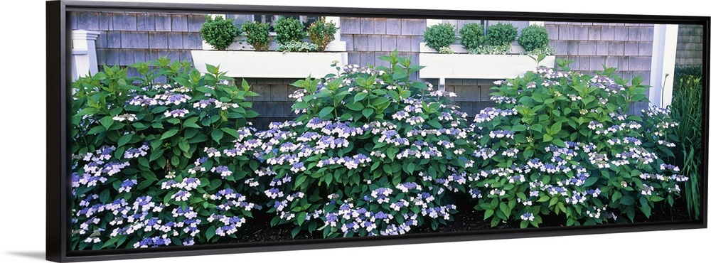 <p>Up-close panoramic photograph of bushes outside of a set of windows with flower boxes.</p>