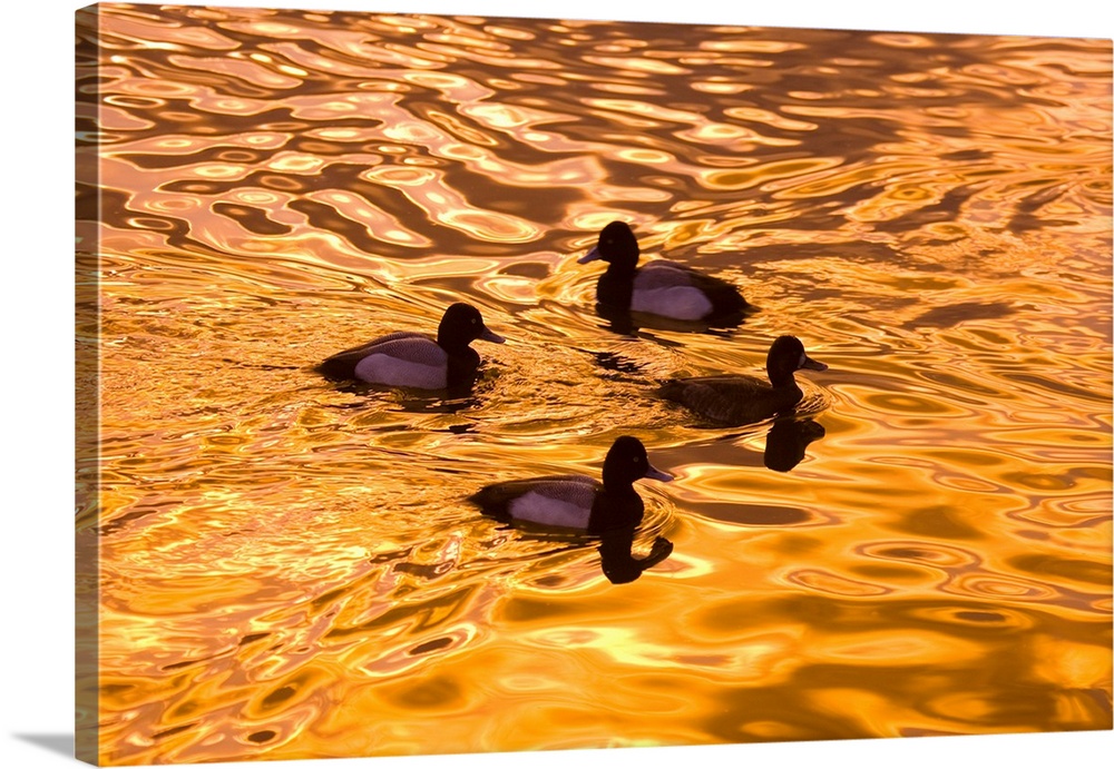 <p>Close-up of four wood ducks (aix sponsa) in a pond at sunset with golden sunlight reflected on the surface. Portland, Oregon, united states of America.</p>