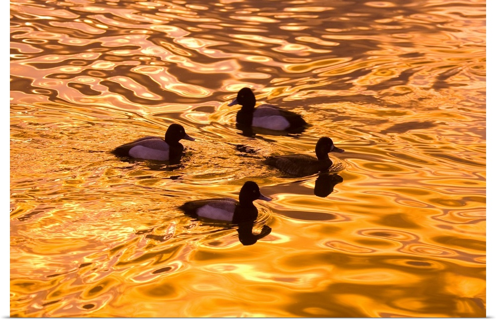 <p>Close-up of four wood ducks (aix sponsa) in a pond at sunset with golden sunlight reflected on the surface. Portland, Oregon, united states of America.</p>