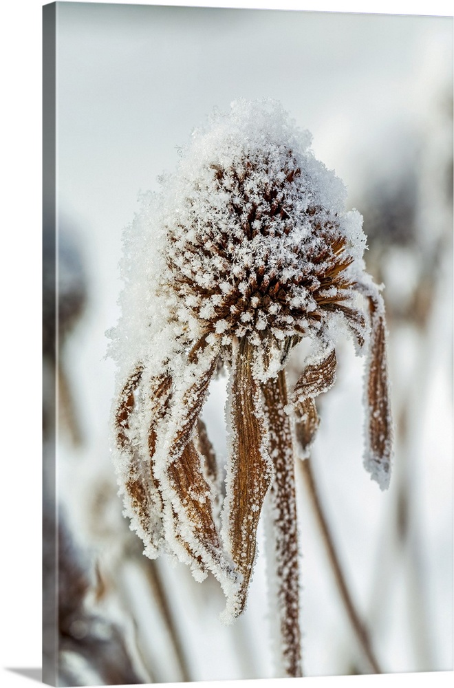 <p>Close-up of frosted dried echinacea stamens; Calgary, Alberta, Canada.</p>