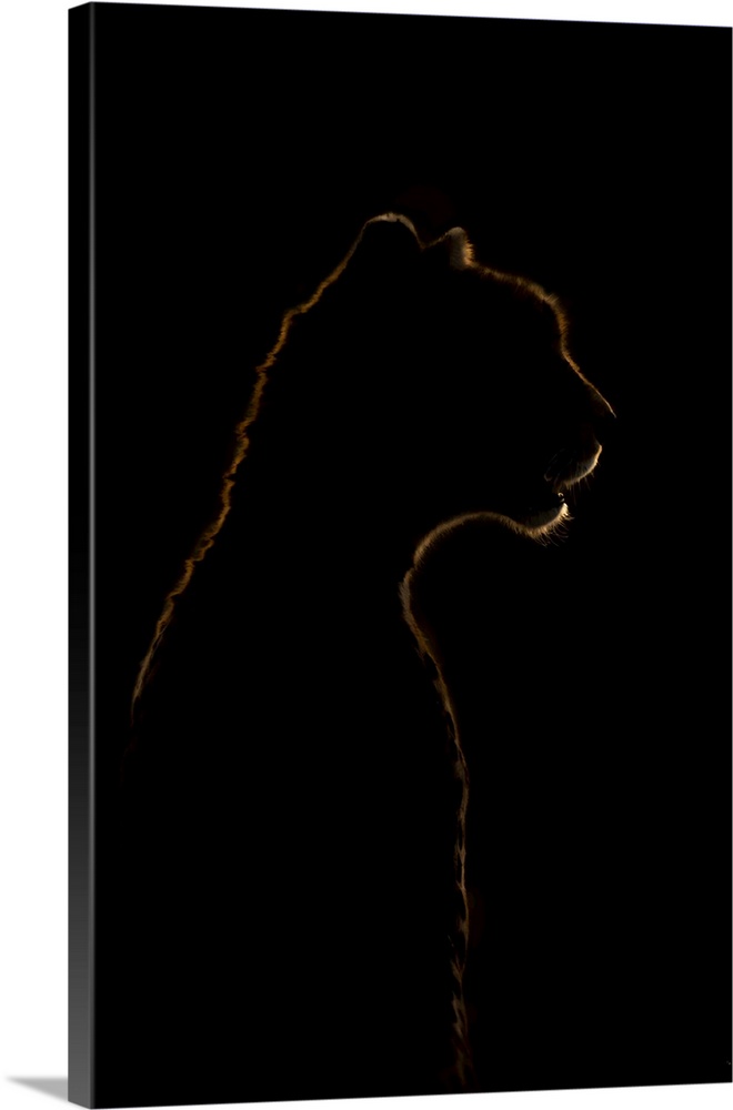 <p>Close-up of golden cheetah (acinonyx jubatus) silhouette in darkness, Serengeti national park, Tanzania.</p>