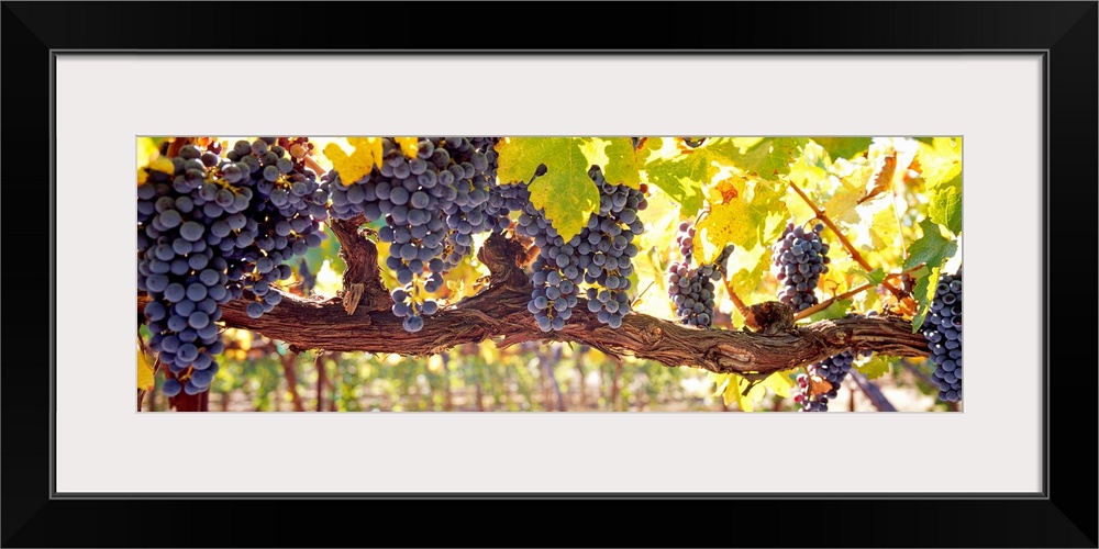 <p>Panoramic canvas art of grape clusters hanging from grape vines in a vineyard.</p>