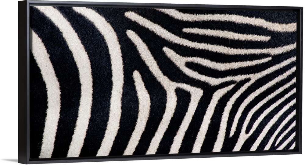 <p>Landscape, close up photograph on a big canvas of fuzzy, greveys zebra stripes.</p>