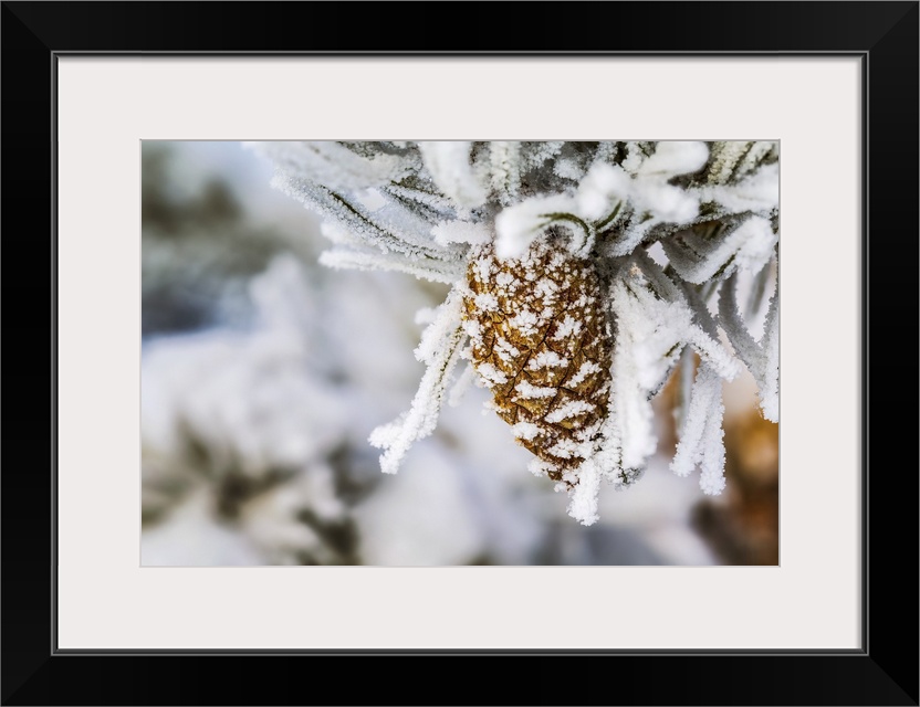 <p>Close-up of heavily frosted pone cone and frosted needles; Calgary, Alberta, Canada.</p>