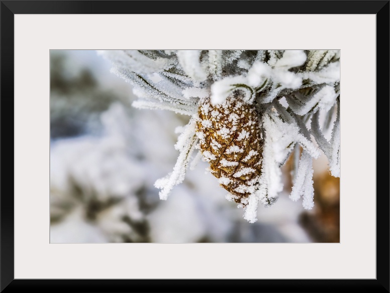 <p>Close-up of heavily frosted pone cone and frosted needles; Calgary, Alberta, Canada.</p>