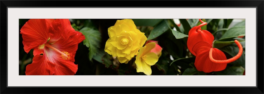 <p>Close-up of Hibiscus, Rose and Anthurium flowers</p>