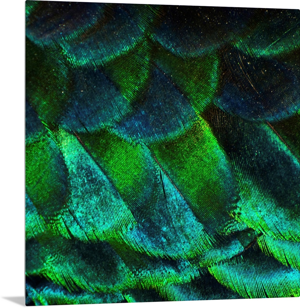 <p>Giant, square, close up photograph of vibrant, shimmering peacock feathers, taken at a zoo.</p>