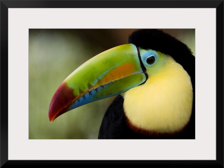 <p>Photograp[h of the face of a Keel Billed toucan in Costa Rica.</p>