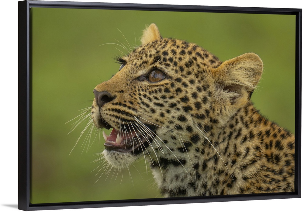 <p>Close-up of Leopard cub (Panthera pardus) with mouth open in Maasai Mara National Reserve; Narok, Masai Mara, Kenya.</p>