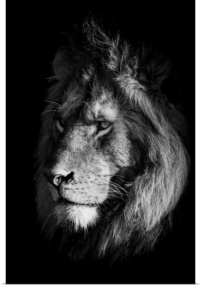 <p>Monochrome close-up of lion (panthera leo) face in shadows, Klein's camp, Serengeti national park, Tanzania.</p>