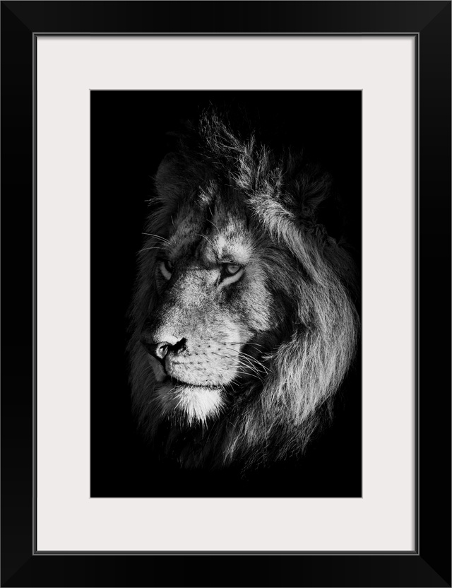 <p>Monochrome close-up of lion (panthera leo) face in shadows, Klein's camp, Serengeti national park, Tanzania.</p>