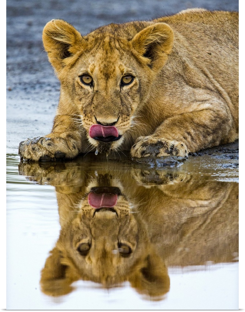 <p>Close up of lion (Panthera leo) lying down near water, Ngorongoro Conservation Area, Tanzania, Africa</p>