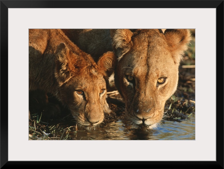 <p>Close up of Lioness (Panthera leo) and cub drinking. Moremi Wildlife Reserve, Botswana.</p>