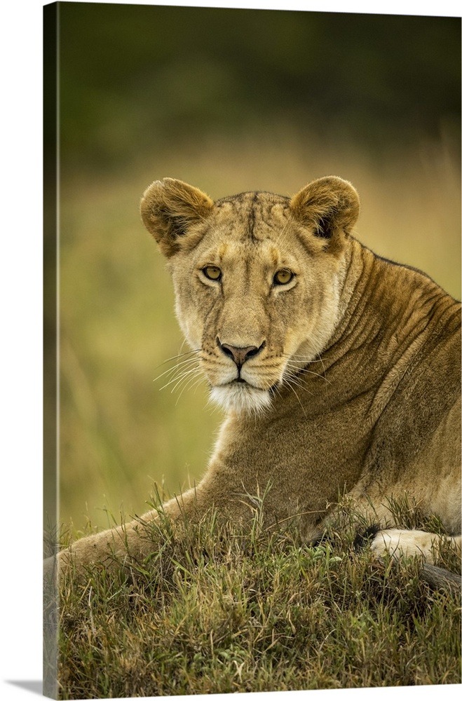 <p>Close-up of lioness (panthera leo) in grass watching camera, Serengeti national park, Tanzania.</p>