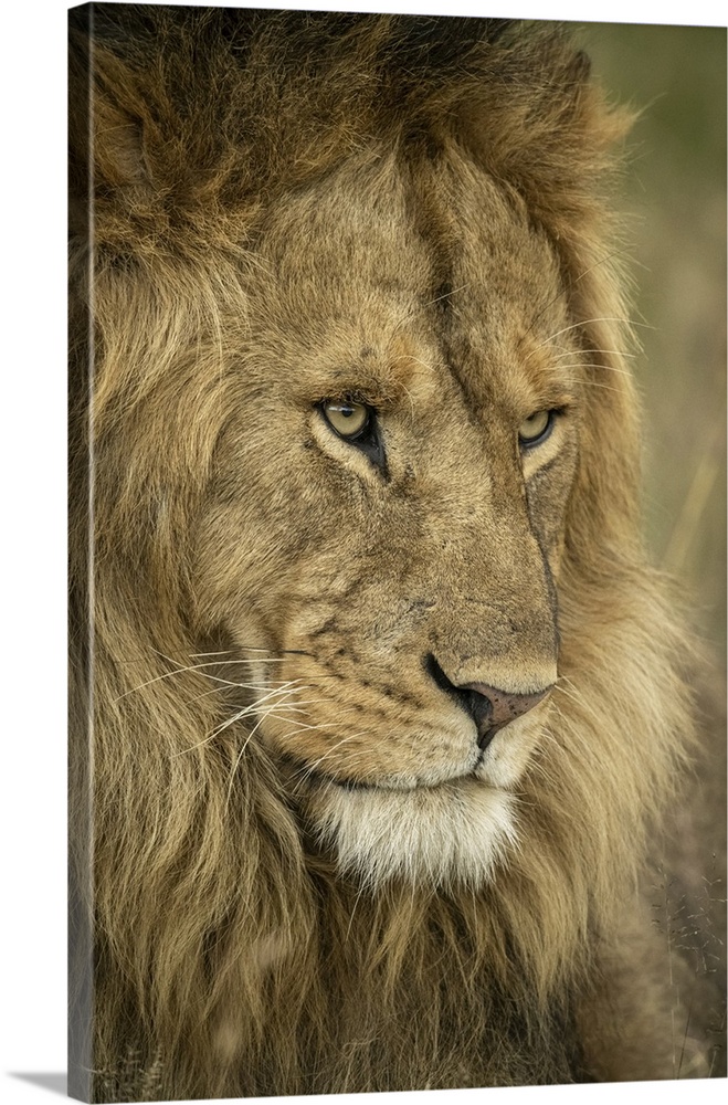 <p>Close-up of male lion (panthera leo) head facing right, Serengeti national park, Tanzania.</p>