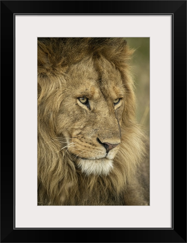 <p>Close-up of male lion (panthera leo) head facing right, Serengeti national park, Tanzania.</p>