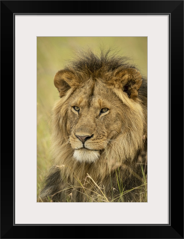 <p>Close-up of male lion (panthera leo) face in grass, Serengeti national park, Tanzania.</p>