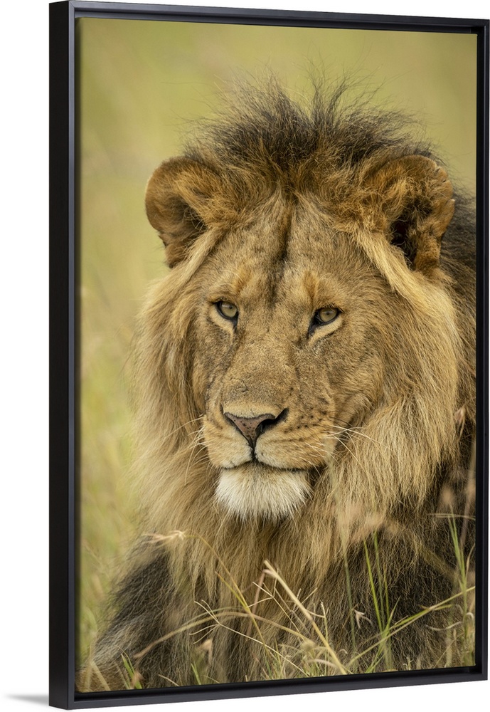 <p>Close-up of male lion (panthera leo) face in grass, Serengeti national park, Tanzania.</p>