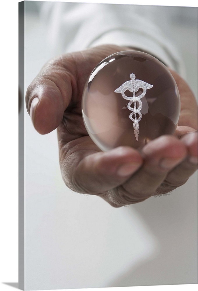 Close up of man holding clear ball with Caduceus symbol