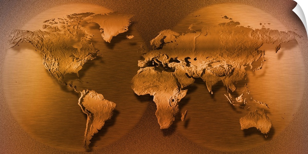 <p>This panoramic piece shows a 3D map of the world in sepia tone.</p>
