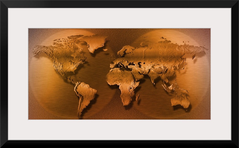 <p>This panoramic piece shows a 3D map of the world in sepia tone.</p>