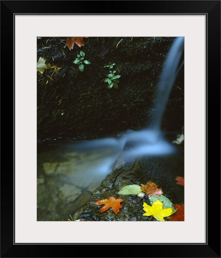<p>Photograph of small waterfall cascading into a small pond with large rock covered in autumn leaves.</p>