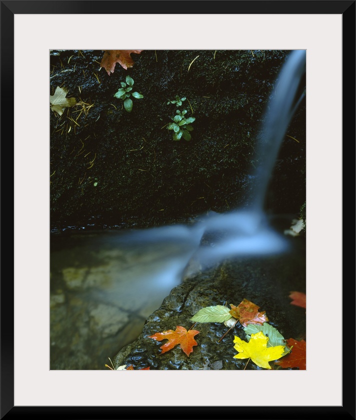 <p>Photograph of small waterfall cascading into a small pond with large rock covered in autumn leaves.</p>