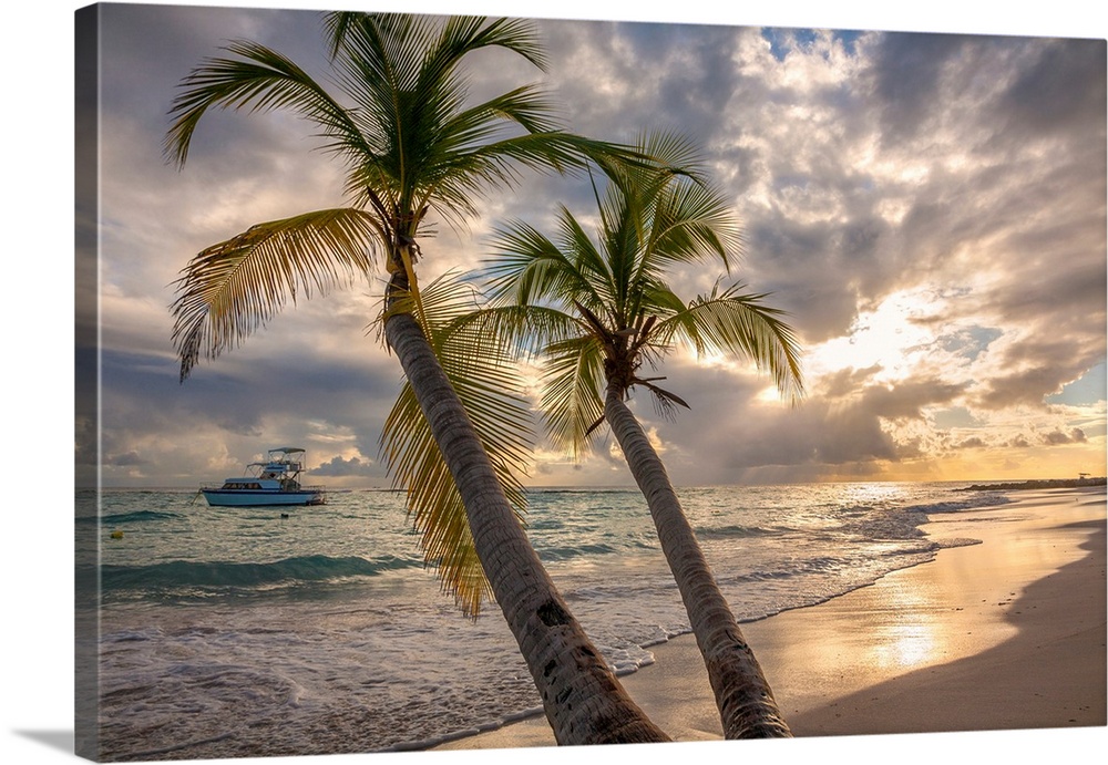<p>Close-up of palm tree with a yacht moored off shore and the turquoise water and foamy surf rolls onto the pristine white sand beach at twilight in the small village of Worthing, Worthing, Barbados, Caribbean</p>