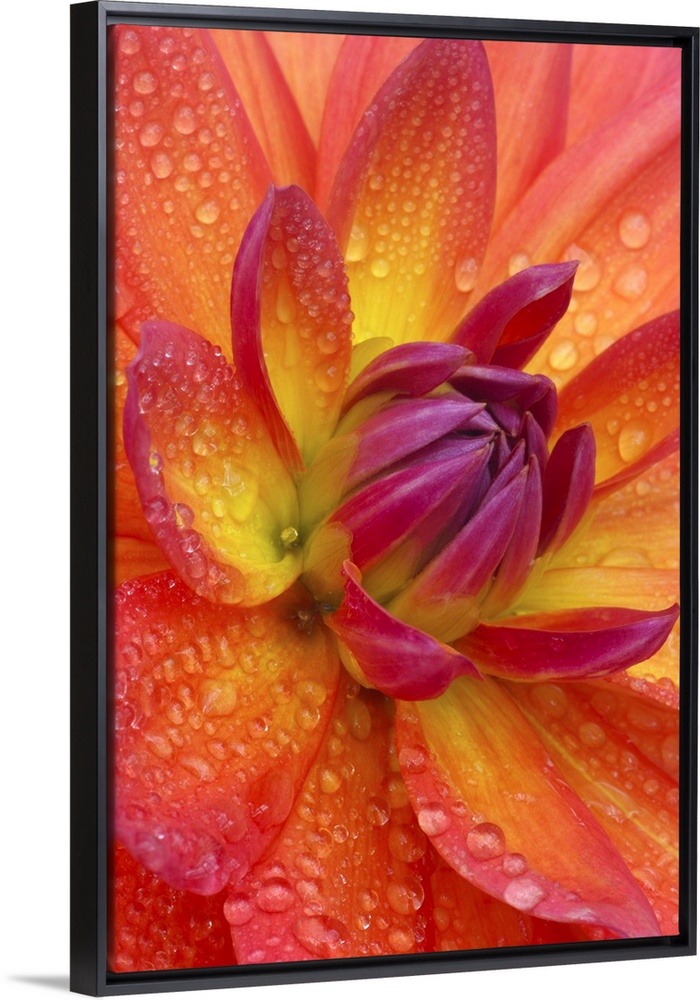 <p>Close-up of petals at the center of a dahlia flower, Dahlia 'firepot'. The petals are shot with orange, yellow and purple and covered with water drops.</p>